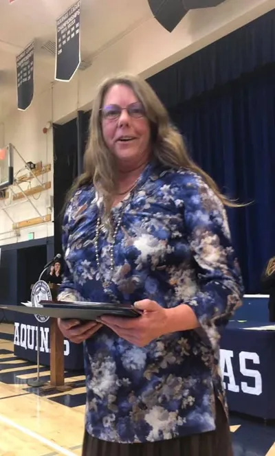 The first winner of the LaRiviere Society's new Excellence in Teaching Award was Ms.Patricia Schneider, pictured here at the Aquinas HS Awards Ceremony on May 22, 2019. Ms Schneider taught at Aquinas for many years, and retired in 2019. She taught mathematics and was noted for her high energy and concern for EVERY STUDENT. From her students: “It’s impossible to fail her class…she won’t let you!” “She will come in on break and vacations to help us prepare for College Placement exams…” Ms. Schneider, reflecting on her career with AHS… WHY MATH AS YOUR CAREER? “…I got into Math somewhat by accident. I was going to get an engineering degree at Humboldt State when my Mom and Dad’s health started to deteriorate. My studies lead me to a faster way out of college by turning to a teaching credential in Mathematics, in order to finish sooner and return home to care for my parents.” HOW IS TEACHING MATH CHALLENGING TODAY? “…Math is a unique subject to teach. Unlike other subjects, Math continually builds on the previous lessons. I have had the pleasure to teaching both Advanced Placement and entry-level students. There definitely is a common denominator – All students like to be acknowledged for what they know. As for the non-STEM students…those that are willing to work hard, do very well.” INTERESTS OUTSIDE OF TEACHING “My interests are many. I love to read animal stories. I can also enjoy Science Fiction, but it should be an easy light read (entertaining). Among my hobbies, I enjoy horse back riding with my sister. I love to garden – put me outdoors and I’m happy! I like visiting old people – they are interesting and have great stories to share.” WHY IS TEACHING IN A CATHOLIC SCHOOL UNIQUE? "Teaching in a Catholic school has its perks. I love that I can have an integral relationship with God that I can also share with my students. One of the things I have always done – I include a prayer board in my classroom where students are free to post their own intentions. Each time we pray collectively we include all intentions posted on our board. Teaching at Aquinas High School is different than other high school because Aquinas High School is proud of its Catholic heritage and encourages Catholicism in the classroom. I am allowed and encouraged to respond to faith questions from the students and we can therefore have God-centered conversations and don’t have to worry about it. I can reflect my values and my faith in my teaching. I have used faith stories in my Math word problems and students have looked forward to what I might present on their quizzes and tests. They have even asked…”What faith story question do you have on our test this time, Ms. Schneider?” LOOKING BACK AT YOUR AQUINAS CAREER…SPECIAL MOMENTS? "My greatest memories of my tenure at Aquinas are – the students’ response to my presentations, their excitement at their growth in understanding a math concept, their willingness to come to tutoring when the concept has been difficult, and of course, the “lightbulb” moments and smiling faces when they realize. “I got this!” RETIREMENT PLANS ? "My plans for retirement aren’t that many. I want to rest! I want to garden, growing some of my own vegetables. I want to clean my house and…Did I mention that I want to REST? |